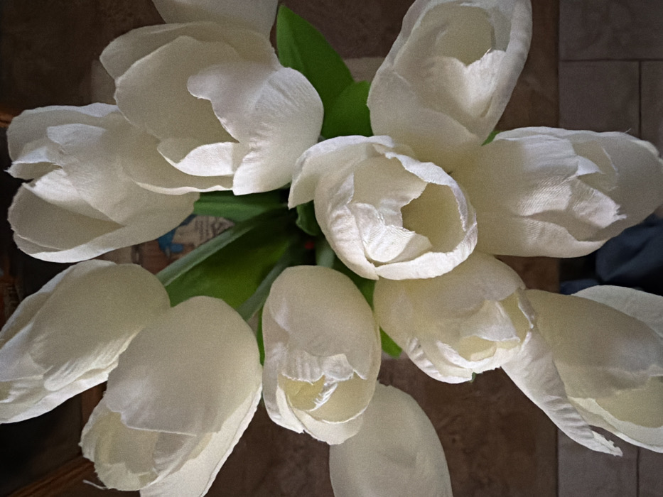 The image displays a top-down, close-up view of approximately ten white or cream-colored tulip-like flowers arranged in a cluster. The flowers exhibit a uniform texture consistent with artificial fabric petals, with their buds partially open. Green stems and leaves are visible beneath and between the flower heads. The background is blurred and indistinct, suggesting an indoor setting with subtle hints of a brown surface, possibly a table or tiled floor, appearing on the left and right edges. There are no individuals, discernible actions, or specific interactions depicted. The precise location within the city of Chaikovsky, Russia, cannot be determined from the visual information provided in the image.