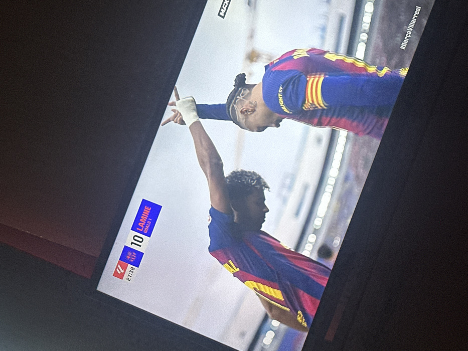 This image, captured in Ivanyane, Bulgaria, displays a television screen showing a football match. The screen presents two male football players, both in red and blue striped jerseys with yellow accents, characteristic of FC Barcelona. The player on the left, with dark, curly hair, is seen from the chest up, leaning slightly forward with his right arm extended upward. The player on the right, whose hair is braided into a bun with shaved patterns on his temple, is also visible from the chest up, with his head bowed. His left arm is raised, with his hand, wrapped in a white bandage, making a gesture with the thumb and pinky extended. The players' raised hands are interconnected. An on-screen graphic at the top left corner displays "27:38", a team logo, the number "10", and "LAMINE GOALS 1". The background on the screen shows a blurred football stadium with rows of empty or sparsely populated seats. A hashtag "#BarçaVillarreal" is visible at the bottom right of the screen. The television screen is surrounded by a dark, unidentifiable room environment.