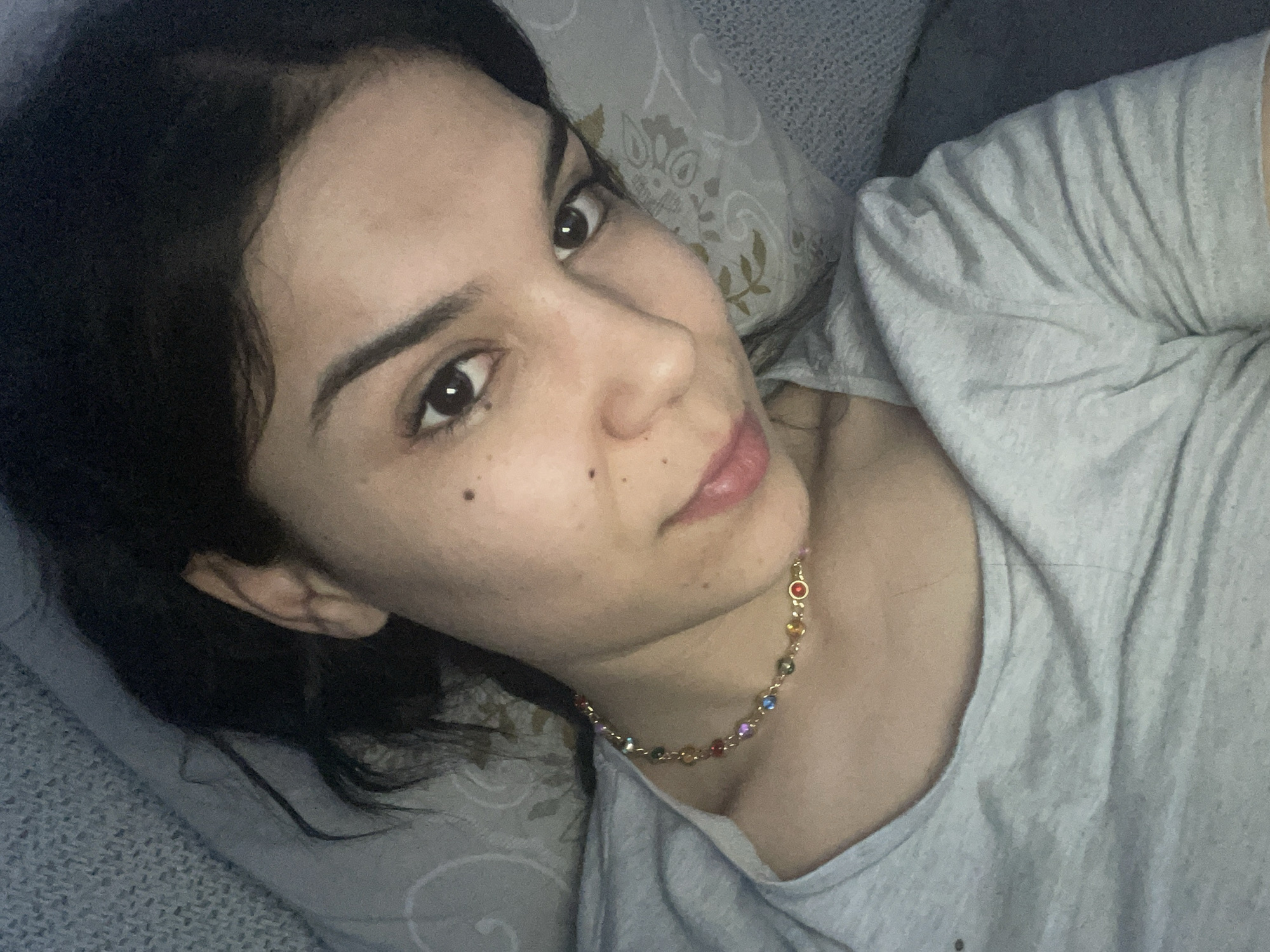 The image displays a close-up, upward-angled portrait of a young adult female, situated indoors in the city of Berlin, Germany. The subject possesses dark hair and brown eyes, with multiple small facial moles visible on her cheeks and forehead. She is attired in a light grey short-sleeved t-shirt. Around her neck, she wears a delicate, gold-colored chain necklace featuring approximately 15 to 20 small, multi-colored round beads in hues of red, orange, yellow, green, blue, purple, pink, and clear. The individual is positioned horizontally, with her head resting on a light grey pillow embellished with a subtle, darker grey floral or leaf pattern. A textured, light blue-grey textile, possibly a blanket or woven fabric, is partially visible in the background on the left and lower right sides of the frame. The subject's gaze is directed towards the camera.