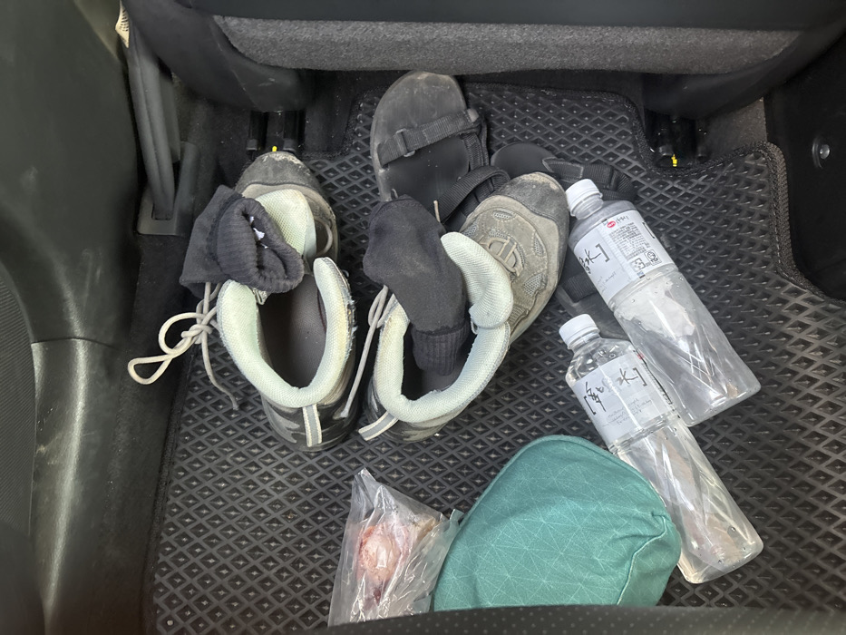 The scene is located within the rear passenger footwell of a vehicle in Meishan Township, Taiwan. The floor is covered by a black, textured rubber mat featuring a diamond pattern. A dark grey car seat is partially visible on the right side of the frame. Two pairs of footwear are present: an upper pair of light grey and black athletic or hiking shoes with dark black socks stuffed inside them, and a white shoelace tied into a loose loop above. A second, lower pair consists of dark-colored sandals or water shoes with visible straps; another dark black sock is partially visible, appearing to be associated with this footwear or loosely placed between the pairs. To the lower left, two clear plastic water bottles with white caps and Japanese-labeled labels are lying horizontally. Adjacent to these, a teal fabric bag or soft container is partially visible on the far left. In the upper left, a clear plastic bag contains raw meat, possibly poultry parts, exhibiting reddish discoloration. The items are arranged casually on the vehicle's floor mat.