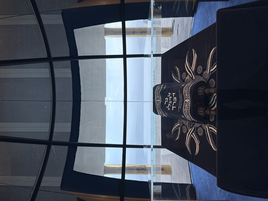 - "A dark blue Torah scroll, intricately embroidered with silver Hebrew text including "כי מציון תצא תורה ודבר ה' מירושלים" (For out of Zion shall go forth the law, and the word of the Lord from Jerusalem), rests on a dark blue fabric-draped table" by FM-TTjlL2, licensed under CC BY 4.0