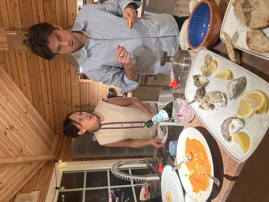 This image captures an indoor scene in a kitchen located in Boda, Sweden. The environment features walls and an angled ceiling constructed from light-colored wooden planks, consistent with a log cabin or rustic home interior. Two individuals are present: an adult female on the left and an adult male on the right. The female has dark hair pulled back and wears a cream-colored sleeveless top with dark trim and gold buttons; her mouth is slightly open, and she is looking towards the male. She holds a small white plate with a single oyster. The male has dark, wavy hair and wears a light blue striped long-sleeved button-up shirt; he is looking down intently at a small round blini or cracker topped with orange roe, which he holds in his left hand. A ring is visible on his left hand. A variety of food items and servingware are arranged on a wooden countertop in the foreground and midground. These include a large white plate containing a substantial amount of orange roe or caviar with a silver spoon, a separate white plate with a single pancake or blini, and a rectangular white platter displaying multiple raw oysters on the half-shell garnished with lemon wedges. A metallic champagne bucket holds a light blue-labeled champagne bottle. Adjacent to it is a small, clear glass bowl containing red finely chopped contents, possibly onion. Other items on the counter include a light blue beverage glass, a brown and blue ceramic bowl, a metal shaker/grinder, an empty champagne flute, and a white plate with slices of dark bread. In the background, a stainless steel refrigerator is partially visible to the left, and a modern kitchen sink with a spring-coil faucet is also present. A stove or oven unit is partially visible to the right. String lights are strung above a window on the far left.