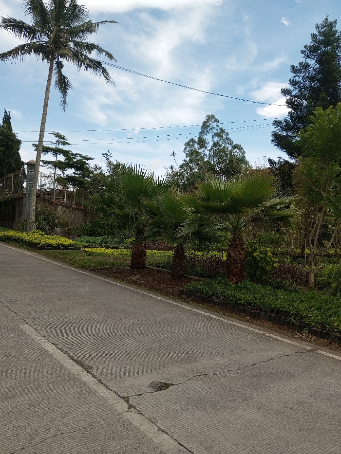 This image captures a daytime exterior scene in Ariyalai, Sri Lanka, depicting a paved road bordered by dense vegetation under a partly cloudy sky. The grey concrete road occupies the lower half, featuring distinct ripple-like textural patterns, a horizontal expansion joint or crack, and a small dark stain. To the right of the road, a green verge contains rows of small plants in dark planters, leading to three mature, short palm trees with thick, fibrous trunks and prominent fan-shaped fronds. Beyond these palms lies a densely planted garden or nursery area with various green and reddish foliage, backed by a mix of taller trees including slender, light-green deciduous types and darker evergreens. On the left, a tall, slender coconut palm tree stands prominently, adjacent to a light-colored pillar or column. A concrete or stone wall with a visible railing structure runs parallel to the road on the left, supporting additional cultivated plants. Overhead, several thin, dark power lines or communication wires traverse the sky horizontally. No individuals, vehicles, or animals are present in the scene.
