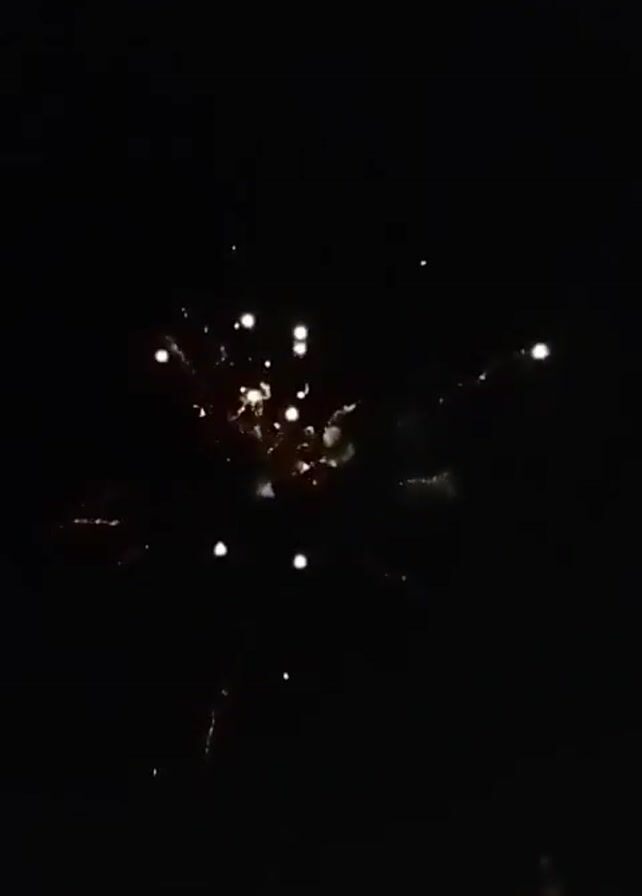 fireworks exploding in the night sky. The fireworks are mostly gold and white, with some red. They explode in various shapes, some like flowers or stars. The sky is black and the video is filmed at night. There are no people visible in the video.