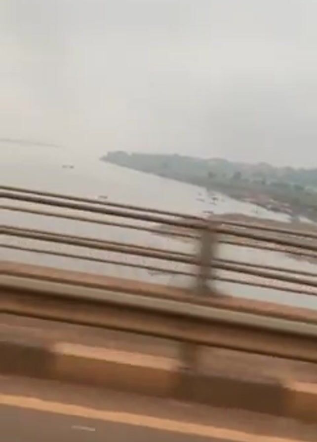view from a vehicle crossing a bridge. The bridge has brown concrete and gray railings. A wide river is visible from the side of the bridge, with some small boats on the water. The opposite bank of the river is slightly hazy. At one point, a motorcycle carrying two men passes the vehicle filming. The sky is overcast.