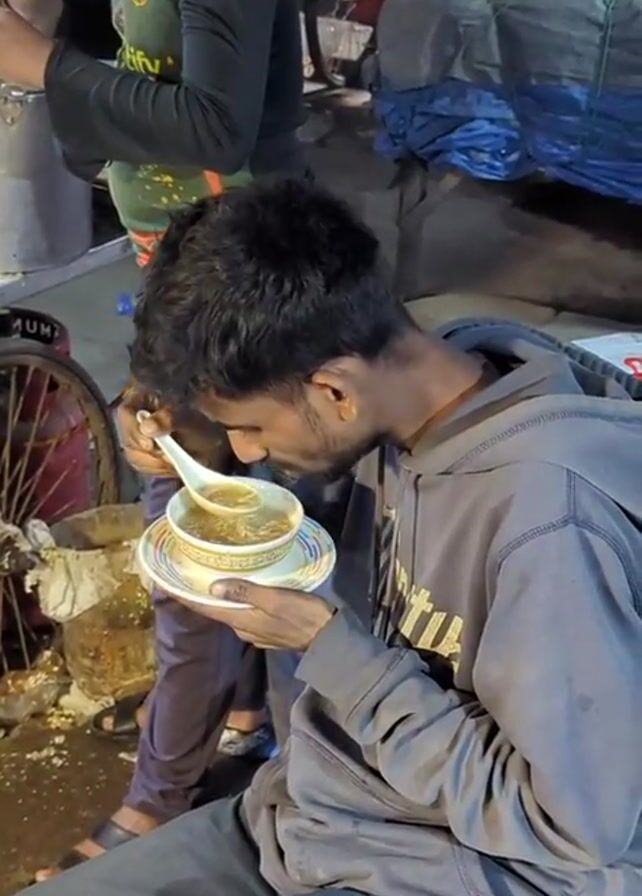- "A man in a gray hooded sweatshirt sits outdoors and eats soup from a small white and gold patterned bowl with a white spoon" by FM-9iqtw2, licensed under CC BY 4.0