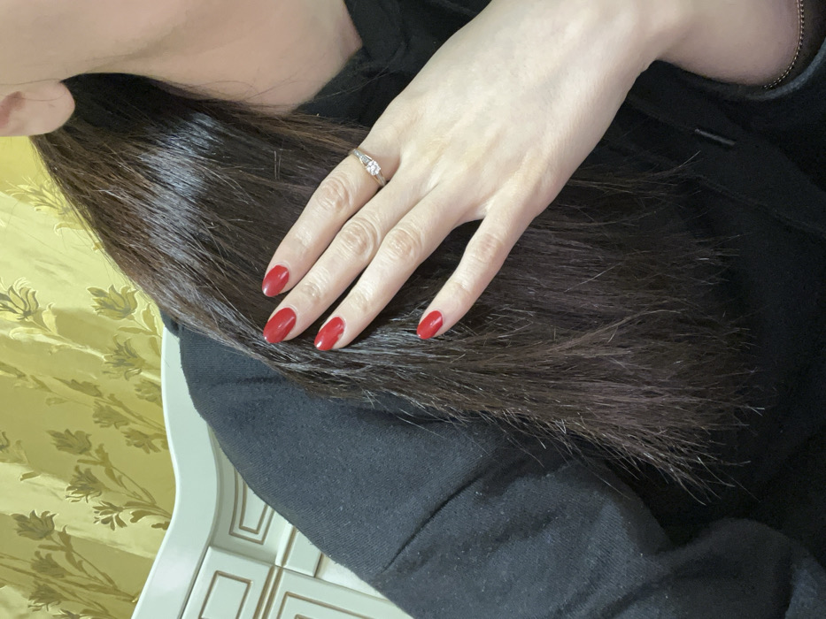 A hand rests upon dark, straight hair against a background of a black hoodie. The fingernails are painted a glossy red. A ring is visible on the ring finger of the hand. A hint of a yellow, floral curtain is glimpsed on the left, along with a white chair. The composition is taken from a slightly high, angled perspective, focusing on the contrast between the hand, hair, and clothing.