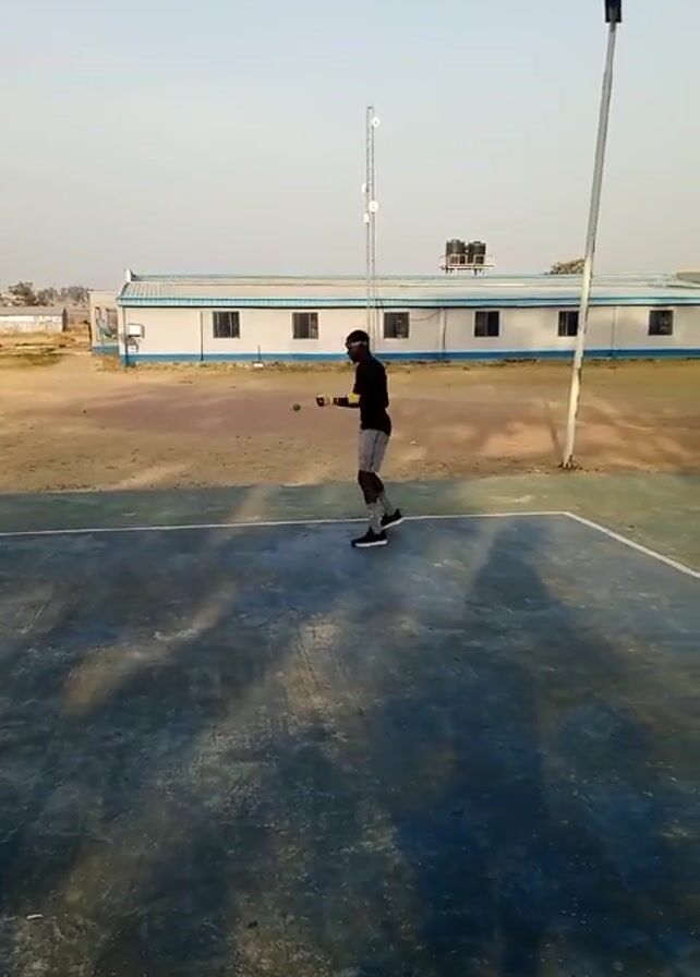 person standing on a concrete court. The person is wearing a black long-sleeved shirt, gray shorts, black shoes, and a headband. They also appear to have an object strapped around their right hand. The person is holding a green tennis ball and is throwing it up in the air and catching it. They are standing on a blue and gray concrete court with a white outline. There is a white pole with a light fixture on it in the background. Behind the court, there is a dirt field with a white building with blue trim in the background. The sky is blue and clear. The lighting suggests it is daytime. A tall communications tower with antenna is visible behind the person.