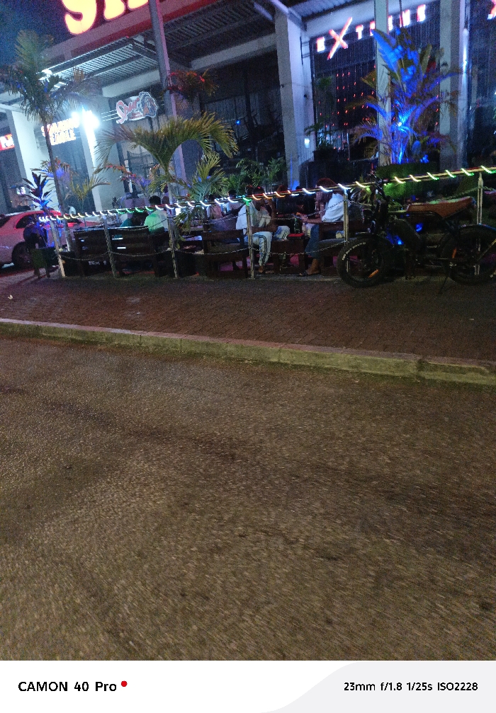 An outdoor seating area with people seated at tables is illuminated by string lights. Green plants are interspersed among the tables. A motorcycle is parked at the end of the seating area. A sidewalk borders the seating, and a street is visible in the foreground. Buildings with bright signs are in the background, indicating a commercial area. The photo was taken with a CAMON 40 Pro camera.