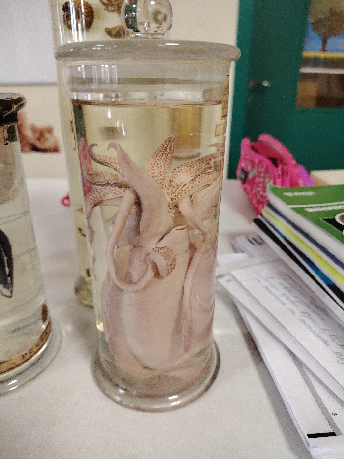 - "A preserved cephalopod specimen is contained within a transparent glass jar with a clear glass lid, situated on a light-colored surface" by FM-gyP5C3, licensed under CC BY 4.0