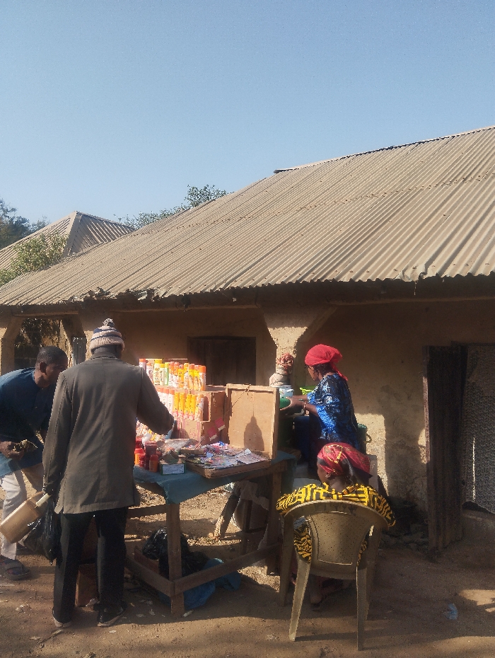 The image depicts an outdoor market scene in Unguwan Rimi, Nigeria. A wooden market stall, covered with a blue fabric, stands on dirt ground in front of two single-story buildings with corrugated metal roofs. The stall displays various packaged items, including numerous brightly colored vertical packages, small bottles, and printed materials. Four individuals are present. On the left, a man in a blue shirt and light pants holds a light-colored cylindrical object and a black plastic bag. He faces the stall. To his right, a man in a dark jacket and a light-colored beanie stands with his back mostly to the viewer, engaging with the stall's contents. Behind the stall, a woman wearing a blue patterned dress and a red headscarf attends to the items. In the foreground to the right, a second woman, dressed in a yellow and black patterned top and a red headscarf, sits on a plastic chair, her back to the viewer. The background features a clear blue sky and sparse tree foliage. The buildings have walls of earthy-toned material.