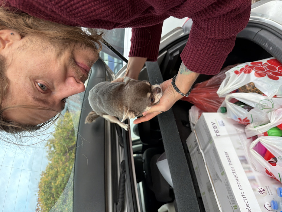 An adult male interacts with a small dog in the open trunk of a vehicle, located in Bjeliši, Montenegro. The male, with shoulder-length light brown hair, a light beard, blue eyes, and a black stud earring, wears a maroon knit sweater, a black beaded bracelet on his left wrist, and has visible tattoos on his left forearm. He is leaning forward, looking down intently at a short-haired, fawn/brown Chihuahua, which rests its front paws on his cupped left hand while its hind legs extend onto the car's dark gray interior. The vehicle's trunk contains multiple white plastic shopping bags, some with red floral patterns, and a prominent white cardboard box labeled "TESY electric convector heater." Through the car's rear window, an overcast sky and out-of-focus green and yellow foliage are visible, indicating an outdoor setting.