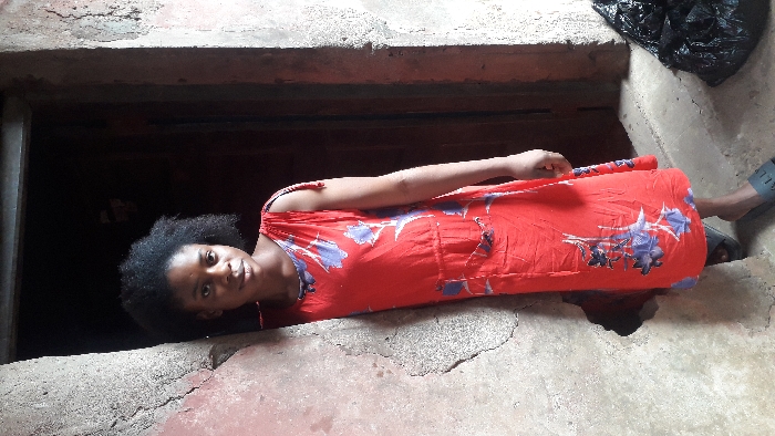 A young woman is depicted standing in a doorway in Onitsha, Nigeria