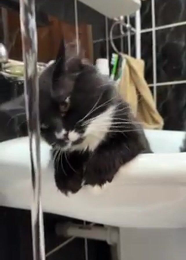 A black and white cat sits in a white bathroom sink under a running faucet. The cat dips its paw in the water and playfully bats at it, occasionally shaking its head to dry off its face. The bathroom has black and white tile walls, and various toiletries are visible on a shelf above the sink.