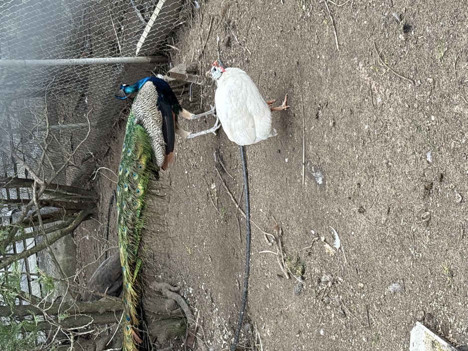 An outdoor scene in General Todorov, Bulgaria, depicts two birds on a dirt surface. In the mid-ground, a male peacock stands with its head and neck displaying iridescent blue plumage, and its long, green-feathered train extending horizontally backward. Its body feathers are a mix of iridescent blue and mottled brown/tan. In the lower-mid ground, to the right of the peacock, a white guinea fowl stands, facing left. It exhibits entirely white plumage with small red and blue skin patches visible on its head. The ground is composed of dry, light brown soil, sparsely covered with small twigs, leaves, and debris. A dark, thin, hose-like object runs horizontally across the mid-ground. The background features a chain-link fence, partially obscured by trees and bare-branched bushes, with a grey wall or structure visible behind them.