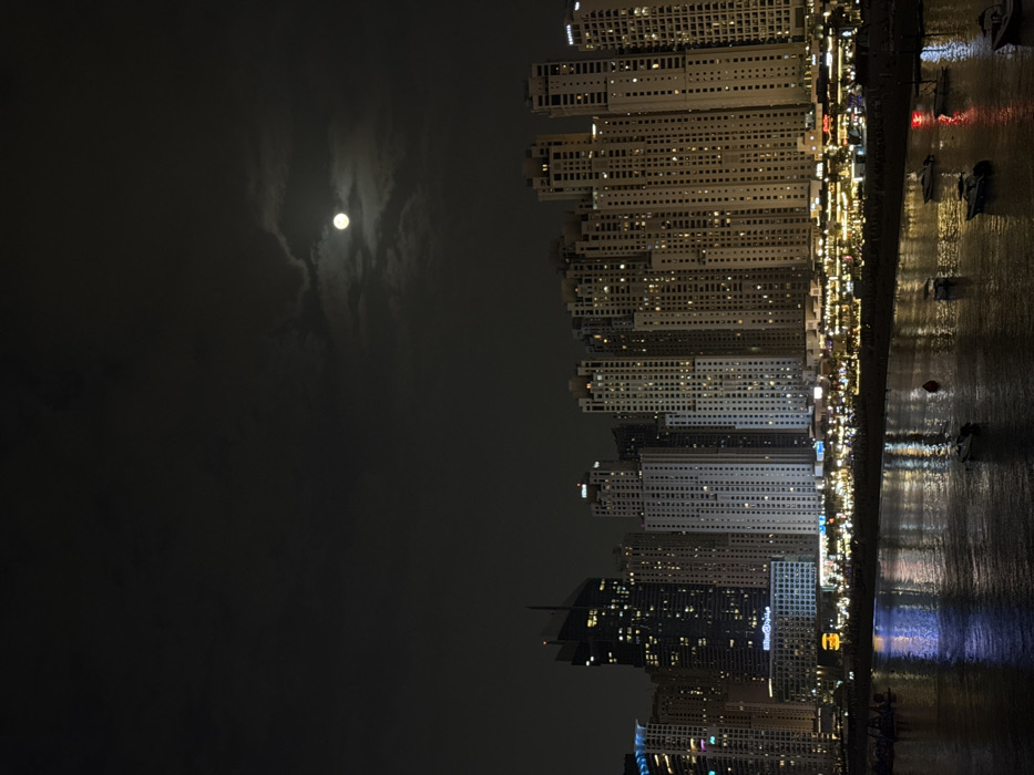 The image displays a nighttime panoramic view of the Dubai Marina and Jumeirah Beach Residence (JBR) area in Dubai, United Arab Emirates. A prominent, bright full moon, partially obscured by dark, scattered clouds, dominates the upper portion of the dark sky. Below the horizon, a dense cluster of illuminated high-rise buildings, primarily residential towers, forms the city skyline. Many windows within these buildings glow with warm light. A "Hilton" sign is visible on a lower-rise building in the left-center of the cityscape. In the foreground, a body of water, likely the Dubai Marina, reflects the city's lights. Several small, white-hulled boats or yachts are scattered across the water, with one boat on the right exhibiting a red navigation light. A red cylindrical buoy is also present in the water. Along the water's edge, a brightly lit promenade or beachfront area is visible, indicating active commercial establishments and the presence of numerous individuals, though individual figures are indistinct due to distance and ambient light.
