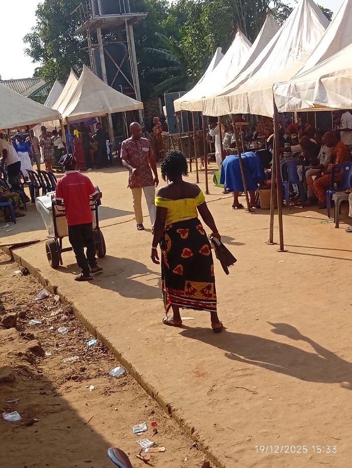 An outdoor gathering features several white tents. People are seated under the tents. A man in a patterned shirt and khaki pants walks by a man in a red shirt pushing a cart. A woman in a yellow and black dress walks away from the camera. The ground appears sandy, with scattered trash along a curb. A water tower is visible in the background. The timestamp “19/12/2025 15:33” is printed in the bottom right corner.