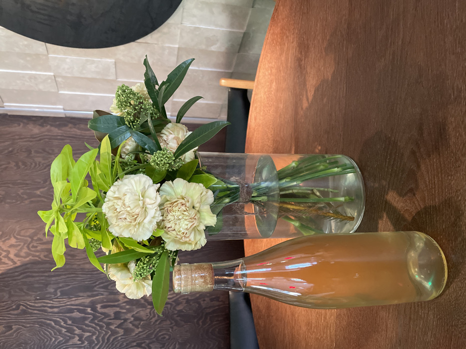 The scene depicts an interior setting in the city of Tver, Russia. A clear glass bottle, sealed with a cork stopper, stands upright on the left side of a dark brown wooden table. The bottle contains a translucent, light amber-colored liquid. To the right of the bottle, a clear cylindrical glass vase holds a floral arrangement consisting primarily of light beige carnations, vibrant light green broad-leafed foliage, and darker green leaves with small green berry-like clusters. The stems of the flowers are visible through the vase, submerged in water and bound together with a piece of twine just above the waterline. The table exhibits a visible wood grain texture. In the background, two distinct wall surfaces are present: a dark brown wall with a prominent vertical wood grain pattern on the left, and a lighter-colored, textured wall composed of horizontally stacked rectangular panels on the right. A partial dark, circular decorative object is visible against the lighter wall. Elements of seating, including a dark upholstered surface and a light-colored wooden chair back, are subtly visible in the blurred background. No individuals, actions, or direct interactions are depicted in the frame.