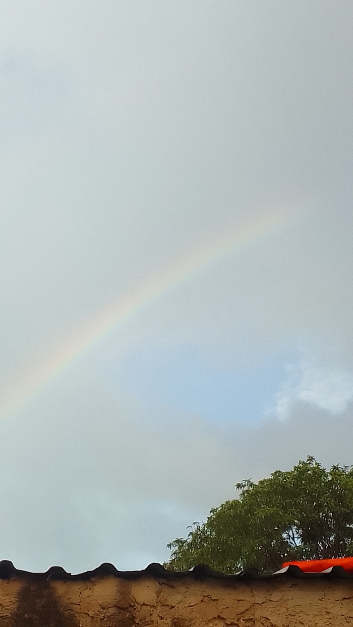 The scene is located in Juan Griego, Venezuela. The upper portion of the image displays an overcast sky, primarily light gray with some areas exhibiting subtle blue tones. A faint, partial rainbow arc is visible, extending diagonally from the lower-left sky toward the upper-right. The lower third of the frame shows architectural and natural elements. A dark, undulated terracotta-tiled roof spans horizontally across the middle-lower section. Below the roofline, a textured, light brown wall, consistent with stucco or plaster, is visible. The vibrant green foliage of a tree is observed behind the roofline on the right side of the frame. No individuals or discernible actions are present.