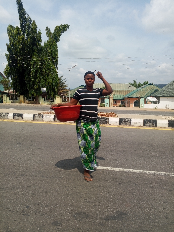 A female subject is depicted walking towards the viewer on an asphalt road in Adankolo, Nigeria, under a bright sky with scattered clouds