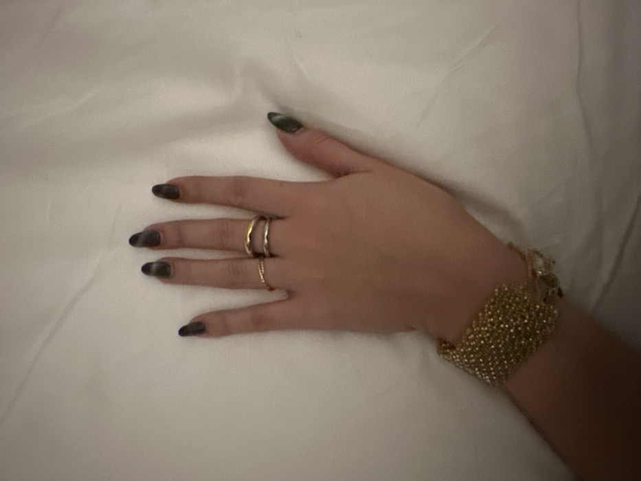 A light-skinned hand lies on a white surface. The nails are painted a dark color, and there are three rings on the middle and ring fingers. A thick gold bracelet adorns the wrist. The fingers are spread apart slightly. The surface is wrinkled, possibly a bedsheet.