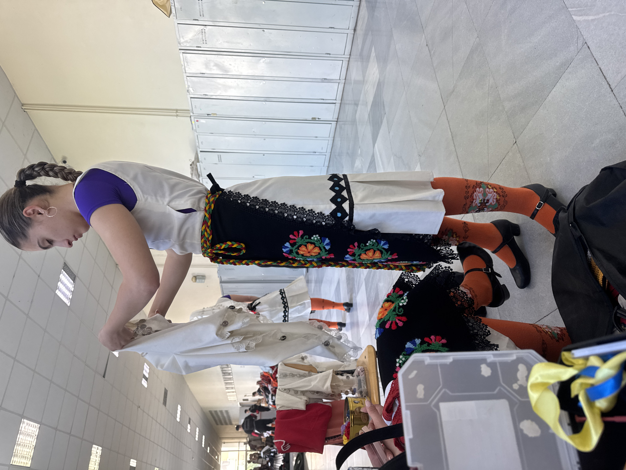 woman indoors, wearing a traditional folk costume with a white dress, a black apron embroidered with colorful floral patterns, and patterned orange tights. She is bending over, apparently handling a piece of white fabric, possibly another part of the costume. Several other people in similar attire are visible in the background, suggesting a group setting, possibly a dance troupe or cultural event. The environment appears to be a brightly lit room with white tiled walls and a checkered floor. A row of white lockers lines the back wall. A clear plastic storage box with a yellow and blue ribbon is in the foreground.