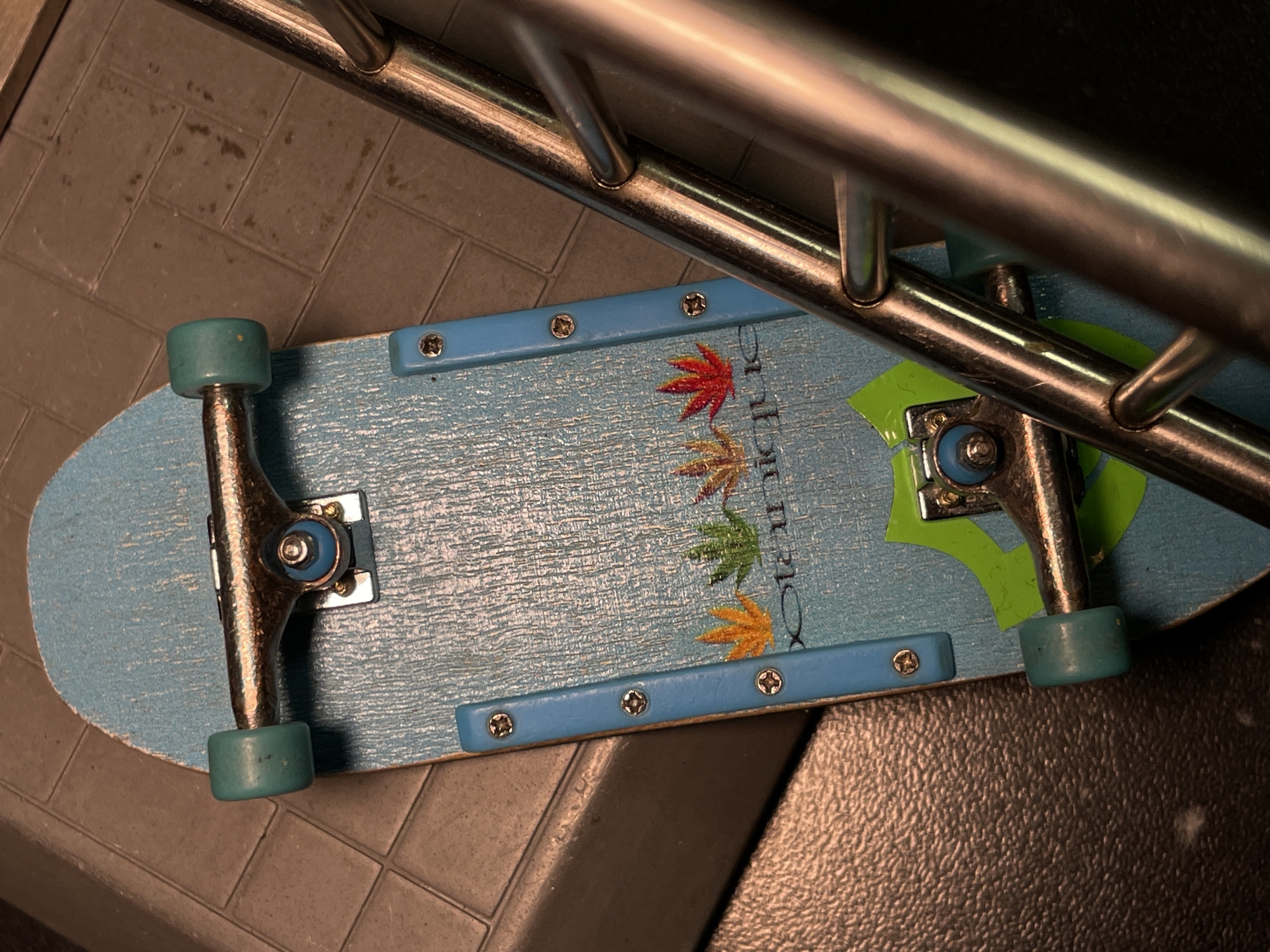 A finger skateboard rests on a surface near metal railing. The skateboard is light blue with blue rails and turquoise wheels. The deck has a design of three maple leaves colored red, green and yellow, stacked vertically. The background consists of flooring of gray tile and dark textured material. The scene appears to be indoors. It is impossible to confirm the Yekaterinburg location without additional information.