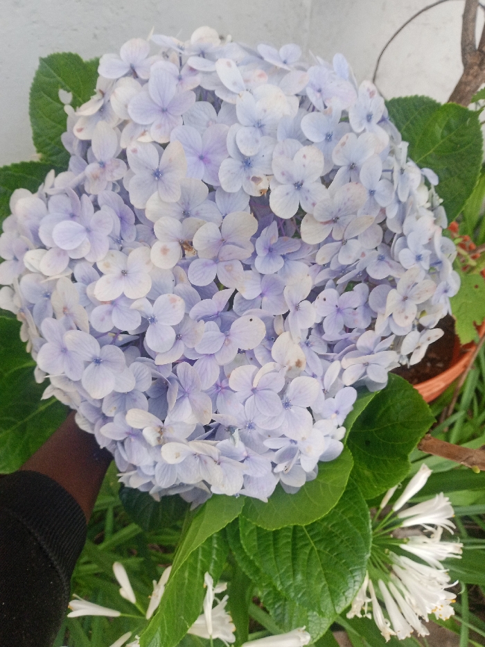 A large, rounded cluster of light purple and white hydrangea blossoms dominates the view. The delicate petals form a dense, almost spherical shape. Lush green leaves provide a contrasting backdrop, enhancing the floral display. A glimpse of a terracotta pot and other greenery suggests an outdoor setting. White flowers are also visible below the hydrangea. A dark-skinned hand, clad in a black sleeve, gently supports the flower, giving a sense of scale.