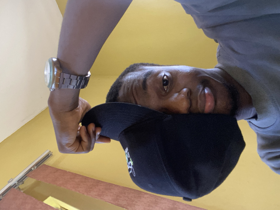 The image depicts an indoor scene in Egan, Nigeria. A dark-skinned individual, appearing to be male, is shown from a low angle, partially obscuring their face with a black baseball cap held by the left hand. The visible right side of the face features a direct gaze, a visible right nostril, and a slightly pursed mouth. A light-colored logo, appearing green and white, is visible on the cap. The individual wears a grey short-sleeved t-shirt with a ribbed collar. A metallic wrist watch with a circular face is present on the raised right wrist. The background consists of a solid yellow wall, with a white curtain track and a brown vertical element visible in the upper left quadrant.