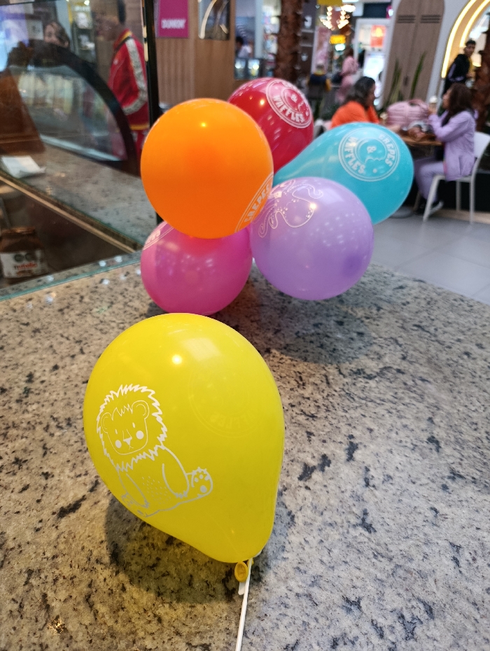 Six colorful balloons, yellow, pink, orange, red, blue, and purple, sit on a gray-speckled countertop. The yellow balloon shows a lion design. Some balloons are printed with "Waffles & Crepes." A glass display case and the inside of a cafe are blurred in the background with people seated at tables.