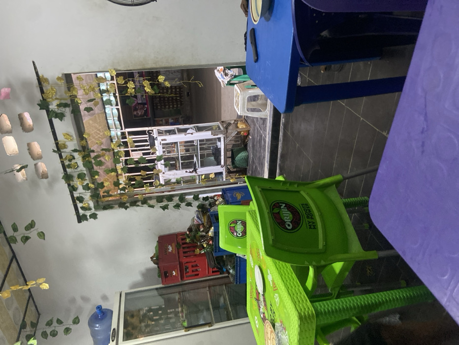 Inside a building, there is a window with leafy decorations. Stacks of crates and boxes with drinks are visible. A green plastic chair, branded with "ORIJIN," stands next to the crates. In the foreground are blue and purple tables with plastic tops. A small white stool is positioned further in, leading into a store-like area.