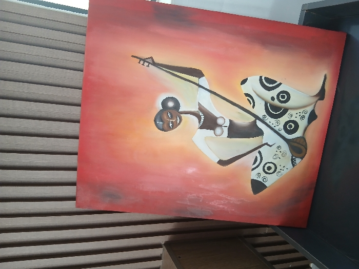 An art piece features an abstract figure playing a stringed instrument against a background of reddish-orange hues