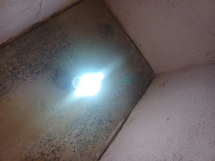 A low-angle shot captures the corner of a room, likely subterranean. The walls are textured and appear unfinished, with one side exhibiting a mottled gray surface and the other a rough, off-white hue. A glaring light source, possibly a bulb, dominates the gray area, creating a bright spot with visible lens flare. The perspective accentuates the angles and surfaces, emphasizing the raw, unrefined nature of the space.