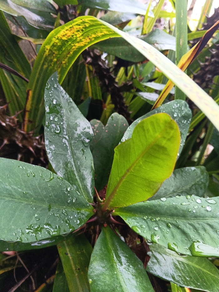 The image displays a detailed close-up of a thorny plant's foliage, located in Inawi, Papua New Guinea. The central subject is a plant with a reddish-brown stem featuring sharp thorns. Multiple dark green, ovoid leaves extend from this stem, their surfaces covered with numerous spherical water droplets, indicating recent moisture. A lighter, vibrant green leaf emerges at the apex of the central plant. The background consists of blurred green foliage, including a variegated leaf with distinct yellow and green patterns, and indistinct dark, spiky forms suggestive of dense vegetation. No human subjects or activity are present.