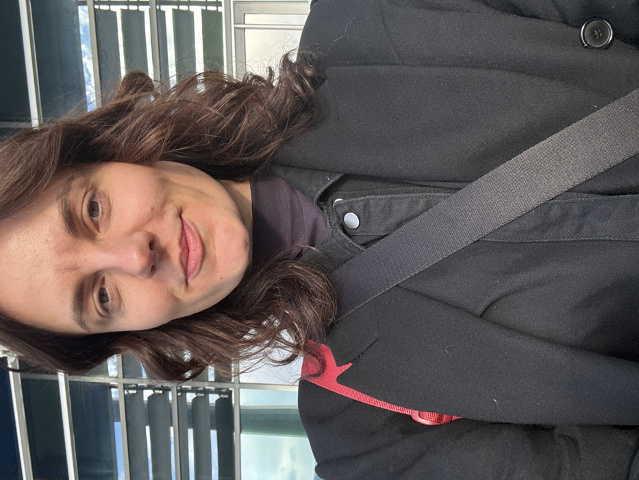 The image depicts a head-and-shoulders portrait of a female subject located in Mrčevac, Montenegro. The subject is an adult with shoulder-length, dark brown, wavy hair. She has a light skin tone, brown eyes, and a small silver hoop piercing in her left nostril. Her expression is a slight, closed-lip smile, and faint lines are visible on her forehead and around her eyes. She is wearing a dark purple or black turtleneck, a black collared garment resembling a denim shirt or jacket underneath a black long-sleeved overcoat or blazer with two visible black buttons on the lower right front. A black seatbelt is diagonally positioned across her torso, extending from her left shoulder downwards. A red strap, consistent with a backpack or bag, is visible over her left shoulder. The background consists of modern architectural elements, specifically large glass panels or windows through which a bright sky with some clouds is visible. Horizontal louvers or blinds are present behind the subject, suggesting an indoor or semi-enclosed location within a building. The lighting is natural and bright. The subject is directly facing and looking into the camera.