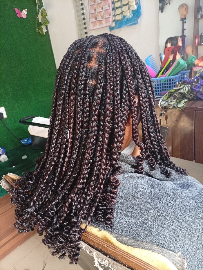 The image captures a rear view of a person seated within what appears to be a hair salon in Sabon Tasha, Nigeria. The individual's head displays numerous long, dark brown to black box braids with defined square partings and distinct curled ends. A grey, textured fabric drapes over their shoulders and upper back. The person is positioned in a chair featuring an exposed wooden frame and a visible worn light-colored cushion. The background on the left consists of a wall section covered in green artificial turf-like material, adorned with a pink butterfly decoration and green artificial leaf vines. A white power outlet and a black stand are present in this area. To the right, a light-colored wall holds a clear plastic sheet displaying illustrations, possibly of hairstyles or hair color charts. A mirror on this side reflects a blue basket containing various colorful hair combs and brushes, a mannequin head on a stand, and additional salon supplies arranged on a wooden surface.