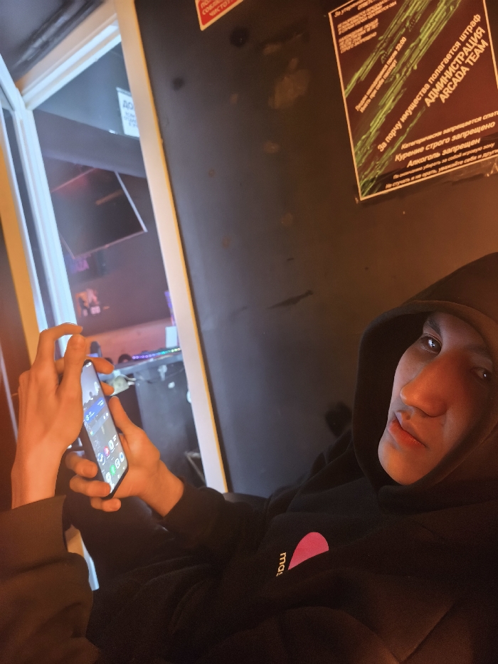 A person wearing a black hoodie uses a smartphone. The backdrop features a dimly lit room with a doorway or window showing another space. A dark wall has two posters attached. One poster prohibits certain actions like smoking and alcohol consumption, and mentions fines for property damage and "Arcada Team." Some of the text in the posters are difficult to read.
