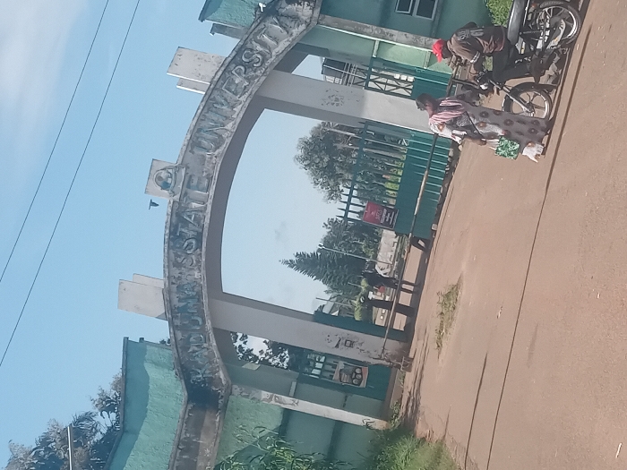 The image displays the main entrance of Kaduna State University, likely situated in Kafanchan A, Nigeria