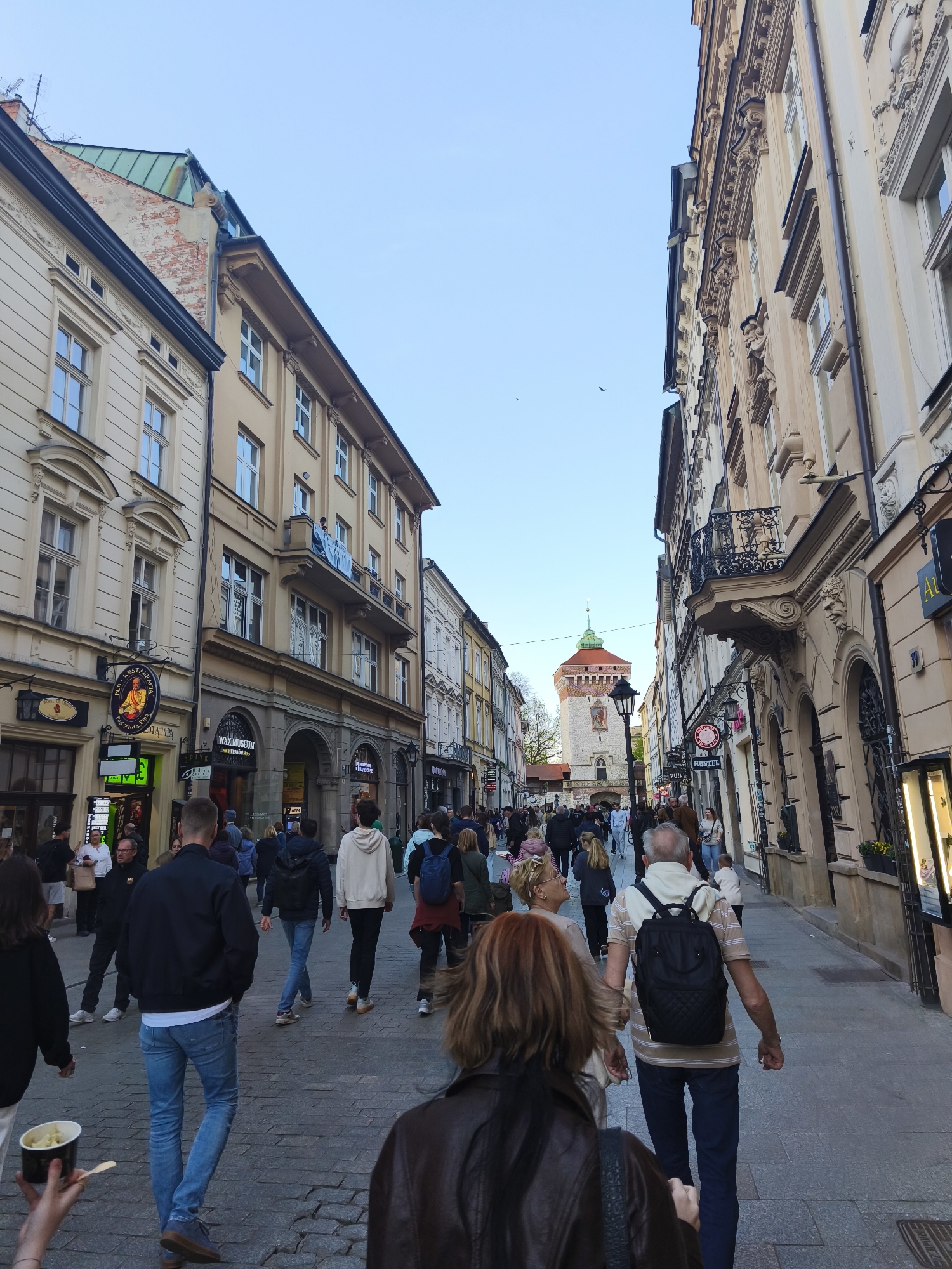 The image captures a street scene in Krakow, Poland, filled with pedestrians