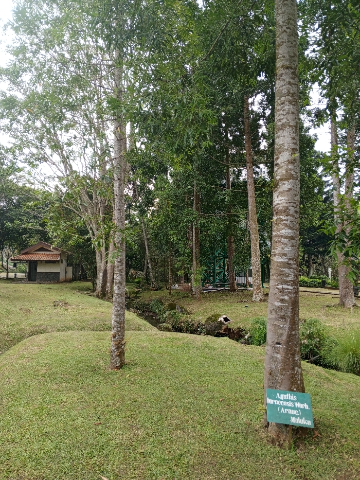 A lush green park features a small building with a brown roof nestled among trees. A shallow stream winds through the grassy landscape. Towering trees dominate the scene, one prominently labeled "Agathis borneensis Warb. (Arnac.) Maluku." The tree trunks are light gray with mottled patterns. A green metal structure is visible in the background amidst dense foliage. The ground is covered in well-maintained green grass.