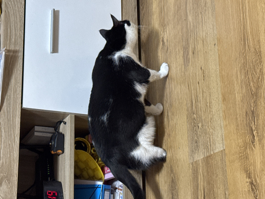 The scene depicts an indoor domestic environment located in Sofia, Bulgaria. A domestic short-haired cat with black and white fur is centrally positioned, moving from left to right across a light brown wood-grain laminate floor. The cat exhibits a low-to-the-ground posture with its head lowered, appearing to investigate the floor. Its fur is predominantly black on its back, head, and tail, with significant white markings on its chest, belly, paws, and irregular patches on its sides. In the background, a light-colored wooden shelving unit is visible to the left. The top shelf contains a black digital clock displaying "4:9", a black electronic device with multiple green indicator lights, and a small black item with an orange accent. The lower shelf holds a stack of papers or books, a blue folder or binder, and a yellow, ornate, possibly metallic object. To the right of the cat, a white cabinet or drawer unit with a single horizontal silver-toned handle is present. The lighting is uniform, suggesting an interior space. No other individuals or animals are present, and no direct interactions are observed.