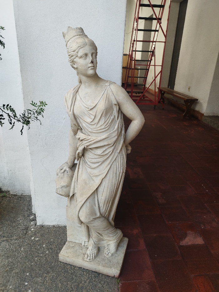 A weathered, light-colored statue of a draped female figure stands on a plinth