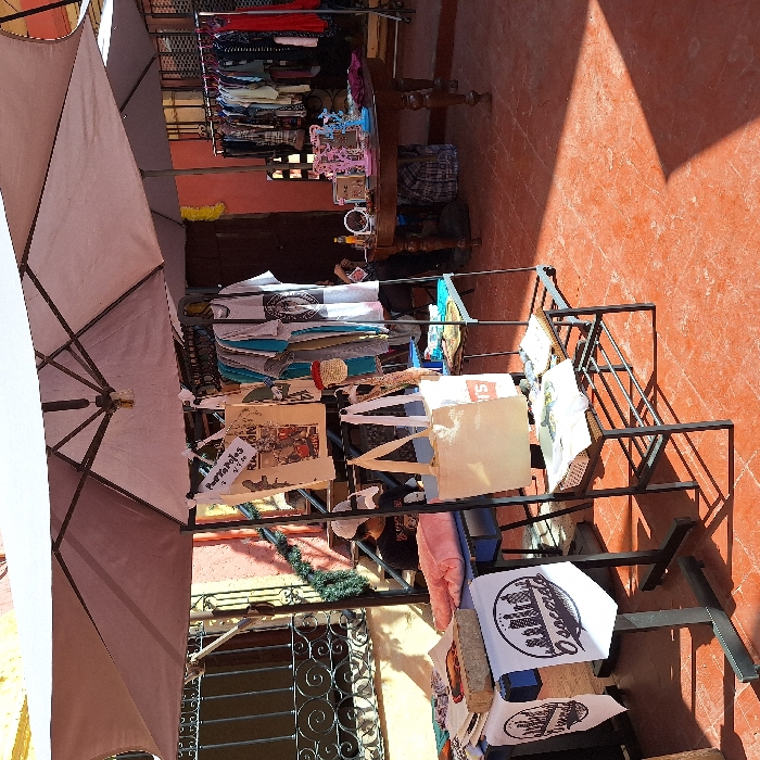 A street vendor displays goods under a large umbrella. Clothes hang from a rack in the background. T-shirts, tote bags, and art prints are showcased on a multi-tiered metal stand. The ground appears to be terracotta-colored, creating a warm tone. The umbrella casts a shadow over the scene.