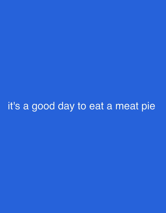 A solid blue background displays the text "it's a good day to eat a meat pie" in white