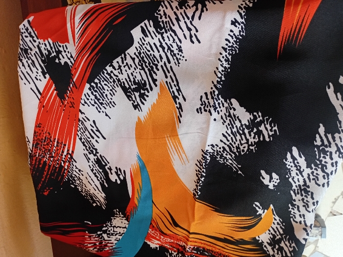 The image displays a folded piece of fabric, exhibiting an abstract pattern primarily composed of black, white, orange, red, and light blue elements