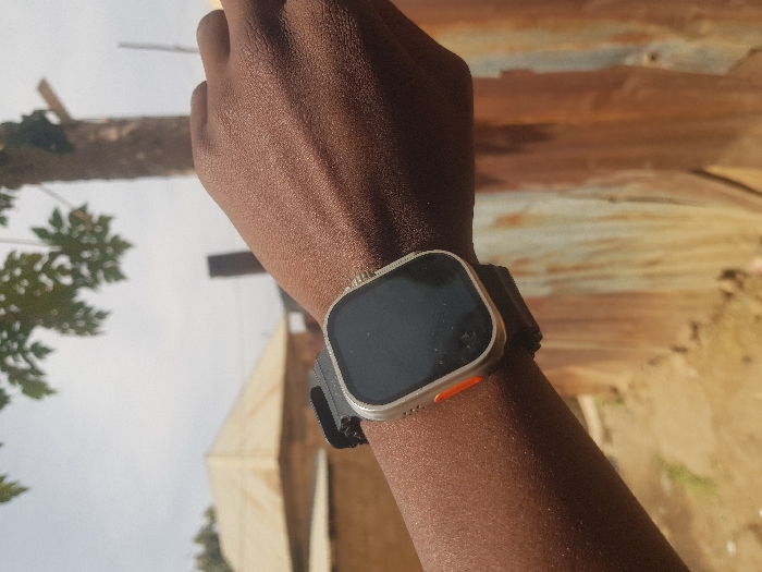 A close-up, slightly upward-angled outdoor shot, located in Jos, Nigeria, depicts a dark-skinned human arm and hand positioned in the lower-left portion of the frame. A smartwatch with a silver-toned, square casing, a dark, marked screen, and an orange side button is secured to the wrist by a black strap. Behind the arm, a rusted, corrugated metal fence stretches horizontally across the midground. The ground below appears as light brown earth. The background features a building with a light-colored, pitched roof on the left, and a tree with green leaves on the right, all under a bright, hazy sky.