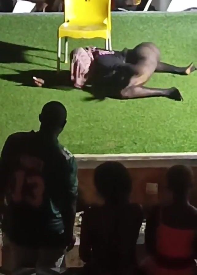 A video shows a person performing on a green artificial turf surface in front of an audience. The performer is wearing a black bodysuit and tights, with a pink head covering. They are positioned on their hands and knees, with their legs extended out to the sides. A yellow plastic chair sits nearby on the turf. The audience consists of multiple people, some sitting on a low wall in the foreground, and others standing or seated in the background. There are drinks and other objects on tables behind the performer.