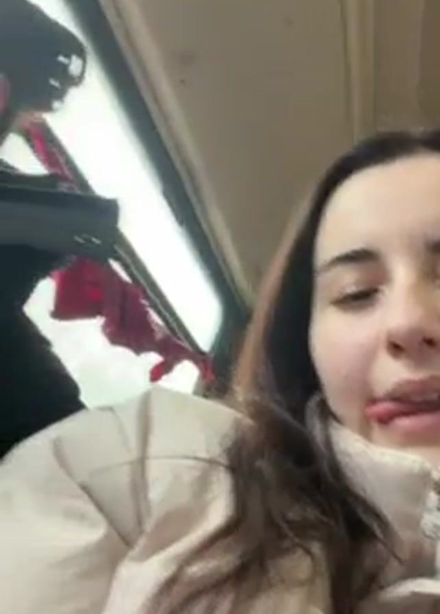 young woman, appearing to be in her early twenties, on what looks like public transportation. She has long dark hair, a light complexion, and is wearing a beige puffer jacket. Beside her sits a young man with dark hair in dreadlocks, wearing a dark jacket. The camera angle is low, suggesting the woman is holding the phone, and it is angled up at their faces. The background shows a window with a partial view of the outside. There's a distinct shaking, indicating the vehicle is in motion. The overall impression is that they are traveling together and she is recording them.