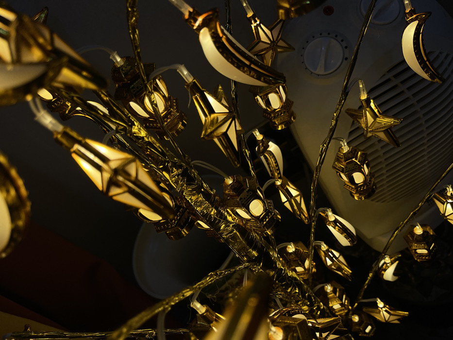 - "A close-up displays a cluster of golden Ramadan-themed string lights featuring lanterns, stars, and crescent moons" by FM-jBMJn1, licensed under CC BY 4.0