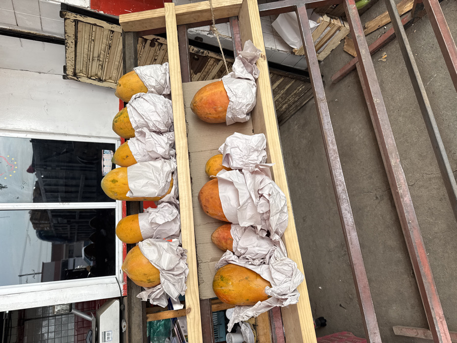 Rows of papayas in a wooden frame. Each papaya is partially wrapped in white paper. The frame is next to a building with a window and red accents. A metal rack is situated beside the papayas. The background includes a concrete wall and glimpses of other objects. The scene is brightly lit.